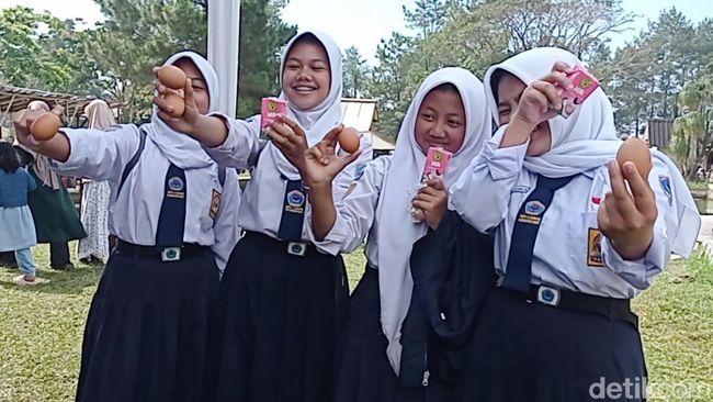 Ribuan siswa SD dan SMP di Kabupaten Bandung Barat (KBB) semringah saat diberi susu dan telur secara gratis. Para pelajar itu tumplek di objek wisata De Ladden, Lembang, Rabu (2/7/2025).