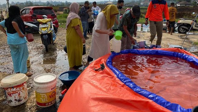 Sebuah kolam darurat berwarna oranye berbahan terpal berdiri di tengah jalan tanah. Ember, jeriken, galon, dan berbagai wadah air tertata rapi di sekelilingnya. Sejumlah warga, dari anak-anak hingga orang tua, tampak sibuk mengambil air, berbagi satu-satunya sumber air bersih yang tersedia hari itu.
