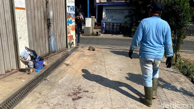 Darah kering berceceran di pelataran bengkel yang berada di Kecamatan Cibiru, Kota Bandung. Dua orang pemuda, salah satunya berinisial F, sedang menutup ceceran darah dengan menggunakan pasir.