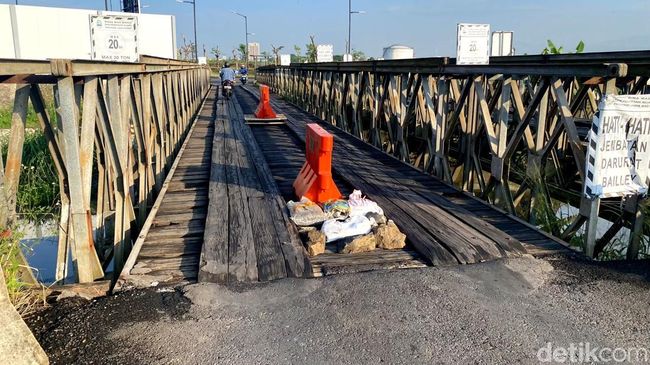 Pantauan detikJabar, Rabu (6/8/2025) pagi, bagian jembatan yang kayunya rusak dan bolong ditutup sementara dan ditandai dengan water barrier. Hal agar tidak ada pengendara yang melintas hingga terjatuh.