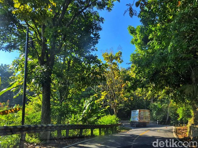 Di beberapa titik, rapatnya pepohonan terbuka, memperlihatkan jurang di sisi jalan. Di dasar jurang, mengalir sungai kecil dengan air bening yang memantulkan cahaya matahari.