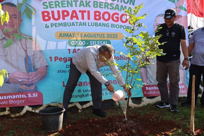 Bupati Bogor Rudy Susmanto menginstruksikan gerakan satu Aparatur Sipil Negara (ASN) menanam satu pohon dan satu pegawai BUMD menanam satu pohon. Gerakan ini dilakukan serentak di seluruh kantor perangkat daerah dan BUMD se-Kabupaten Bogor, Jumat (15/8).