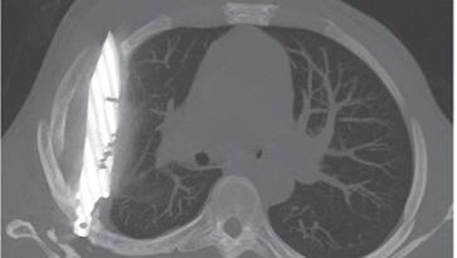 "Rontgen dada lateral awal menunjukkan adanya benda logam tersangkut di bagian tengah dada, dengan bayangan samar di sekitarnya yang mengindikasikan hematoma terlokalisasi kronis yang mengeluarkan cairan, atau fibrosis pascatrauma, kemungkinan besar akibat luka tusukan pisau pasien," tulis dokter dalam jurnal, dikutip dari News18, Selasa (19/8/2025).