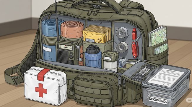 Di dalamnya terdapat berbagai perlengkapan yang mencakup surat-surat penting hingga kebutuhan dasar selama tiga hari. Barang-barang yang harus ada meliputi: