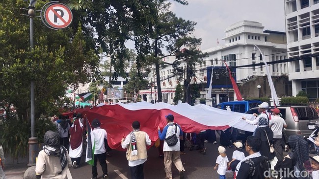 Selama di perjalanan, massa aksi turut membentangkan dua bendera raksasa dua negara, Palestina dan Indonesia. Bendera Palestina dan Indonesia itu berkibar dalam iring-iringan massa menuju Gedung Merdeka.