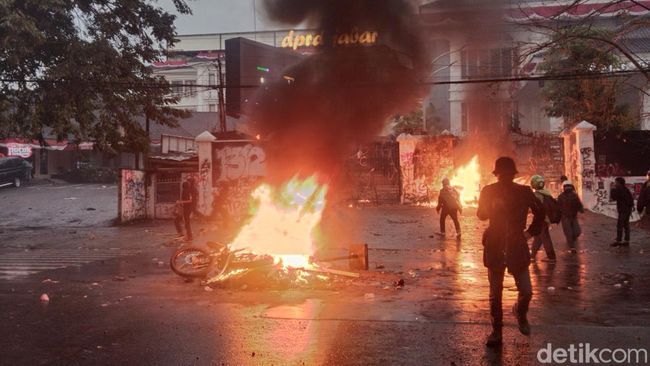 Pantauan detikJabar hingga pukul 17.22 WIB, aksi unjuk rasa di depan kantor DPRD Jawa Barat (Jabar) semakin memanas. Massa memutuskan bertahan hingga sore hari dan berulang kali mencoba merangsek masuk ke gedung dewan.