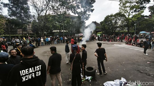 Pantauan detikJabar pukul 14.25 WIB, massa aksi datang dari arah Masjid Pusdai dengan berjalan kaki. Mereka membawa banyak spanduk yang berisi tuntutan dan sindiran, seperti DPR (Dewan Penghianat Rakyat), Indonesia Darurat Demokrasi dan lainnya.