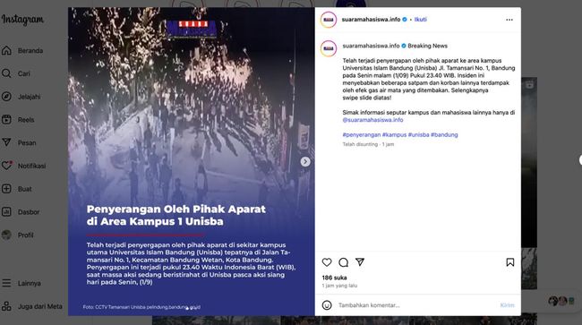 "Telah terjadi penyergapan oleh pihak aparat ke area kampus Universitas Islam Bandung (UNISBA) Jl. Tamansari No. 1, Bandung pada Senin malam (1/9) Pukul 23.40 WIB. Insiden ini menyebabkan beberapa satpam dan korban lainnya terdampak oleh efek gas air mata yang ditembakkan," tulis keterangan postingan terbaru.