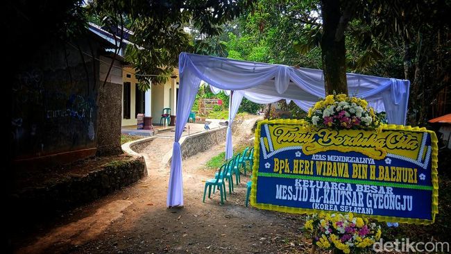 Sebuah karangan bunga berdiri sendiri di tepi jalan kecil Kampung Cimantaja, Desa Cikiray, Kecamatan Cikidang, Kabupaten Sukabumi. Karangan bunga itu dikirim Keluarga Besar Masjid Al-Kautsar Gyeongju, Korea Selatan, teman-teman Heri Wibawa (28) yang ikut berduka dari jauh.