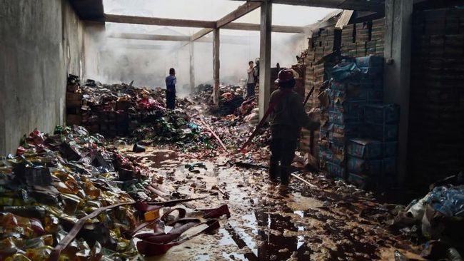 Bagian atap gudang pun bolong besar. Rangka baja tampak gosong dan sebagian ambruk, memperlihatkan sisa-sisa kobaran yang sempat membumbung tinggi ke langit pada malam kejadian.