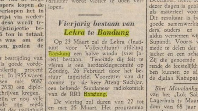"Op 23 Maart zal de Lekra (Instituut voor Volkscultuur) afdeling Bandung een halve windu (vier jaren) bestaan," tulis Preangerbode 29 Februari 1956.