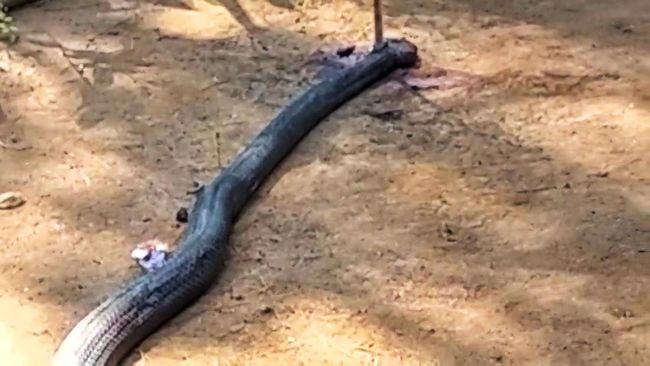 Seekor ular king cobra tergeletak kaku di tanah, sisiknya masih berkilau disapu cahaya matahari pagi. Tubuhnya panjang, hampir empat meter, menjulur di antara dedaunan basah.