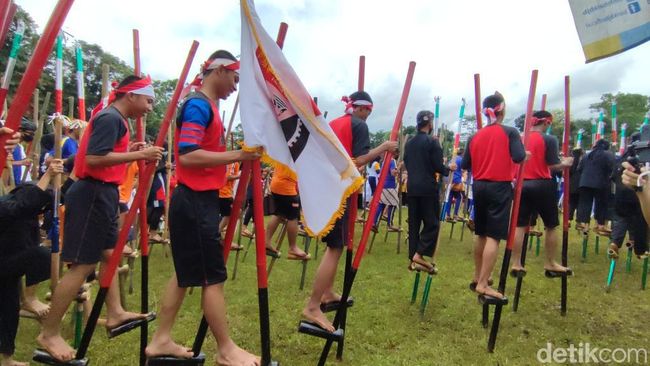 Egrang, salah satu permainan tradisional yang unik karena menggunkan tongkat bambu untuk berjalan. Untuk memainkan permainan ini yaitu dengan cara menaiki bambu dan berpegangan pada bambu tersebut.