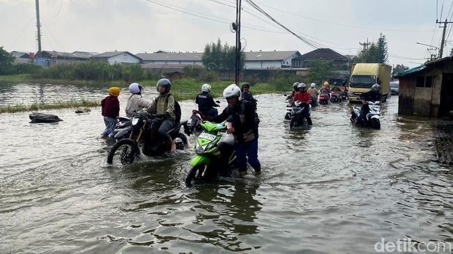 Pantauan detikJabar, Rabu (5/11/2025) genangan banjir di jalan itu dari mulai lutut hingga betis orang dewasa. Banyak kendaraan khususnya sepeda motor yang mengalami mati mesin, salah satunya dialami oleh Umar (32).