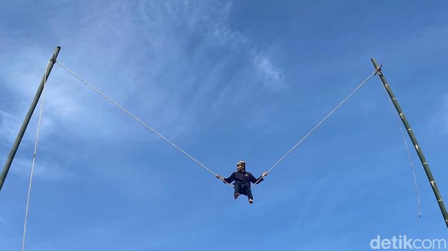 Tidak cukup di sana, aktrasi lain yang dilakukan oleh Saepudin yakni tiduran di seutas tali itu. Lagi-lagi penonton yang lihat menjerit-jerit.