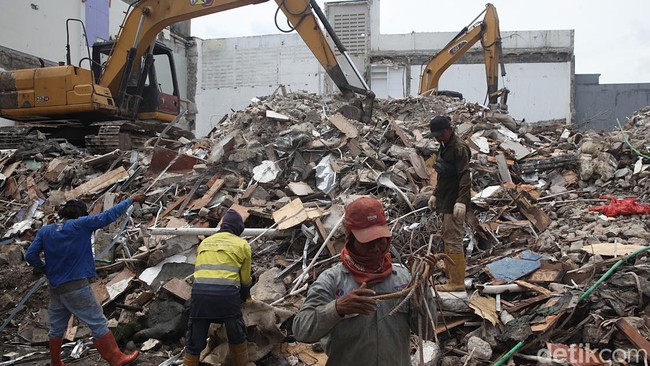 Terlihat ada tiga unit dump truck di lokasi tersebut. Truk itu dikerahkan untuk mengangkut puing-puing bangunan agar bisa segera dibuang.