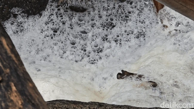 Aliran cairan jatuh langsung ke tumpukan batu besar, membentuk percikan seperti air terjun kecil dengan busa putih kekuningan yang menumpuk di celah bebatuan.