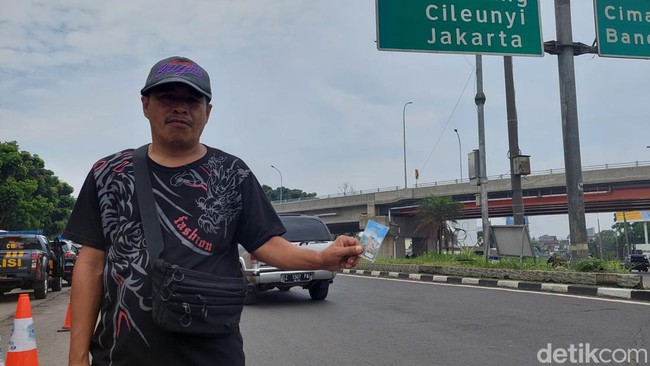 Ia berdiri di Simpang Padalarang sambil mengacungkan tangannya yang memegang kartu E-Toll. Jika ada pemudik yang berhenti, pasti ia kejar demi menawarkan barang dagangannya.