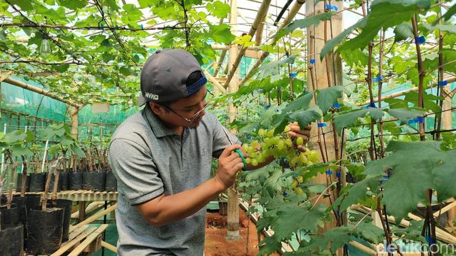 "Jadi kenapa saya tetap membutuhkan bibit lokal itu untuk akarnya karena sangat kuat. Sedangkan untuk rasa saya pakai entres impor. Jadi menghasilkan bibit yang unggul tahan dalam segala medan dan cepat berbuah. Anggur merah, hitam, hijau ada," ungkapnya.