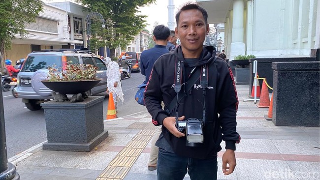Jika ada yang berminat, Mustaqim langsung mengeluarkan kamera DSRL lengkap dengan flash eksternal yang dipasang di kameranya. Wisatawan yang menggunakan jasanya pun langsung berfoto dengan pemandangan Jalan Asia Afrika.
