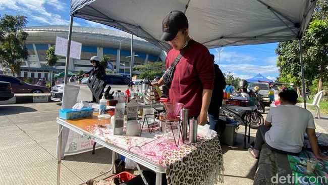 Tak hanya itu, dua buah tikar digelar untuk digunakan pembeli sambil menikmati kopi yang dijualnya. Kepada detikJabar, Fahmi mengaku sudah berjualan kopi di sekitar Stadion GBLA setahun yang lalu.