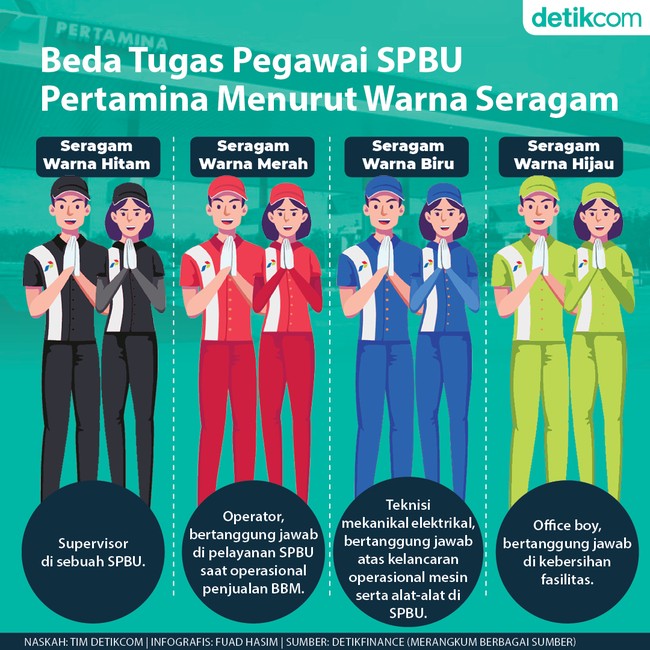 Pegawai SPBU Pertamina memiliki peran tugas masing-masing. Warna seragamnya pun berbeda-beda.