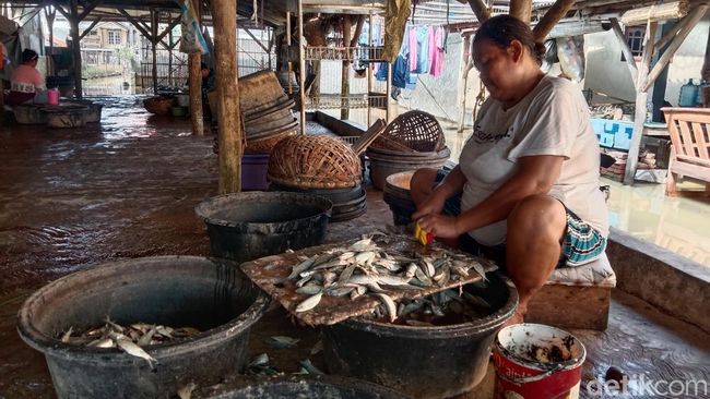 Pantauan detikJabar di tempat pengolahan ikan, terlihat sejumlah ibu-ibu tengah sibuk di antara genangan banjir rob. Mereka hanya fokus dengan ember besar berisi puluhan ikan tembang yang kemudian mereka olah menjadi ikan manis.