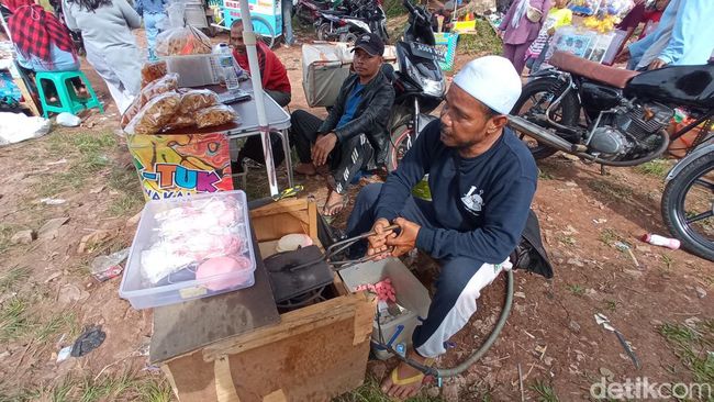 Bagi Abeh (60), berdagang di Bukit Candi adalah keharusan. Setiap Minggu pagi ia duduk di pinggiran jalan dengan kompor yang didesain sedemikian rupa untuk menahan angin yang menerpa. Ia menyiapkan sebuah makanan yang terbuat dari Aci yang sudah diolah dengan berbagai bumbu lantas mencapitnya dengan dua besi panas.