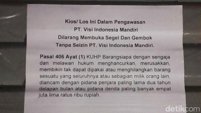 "Sekarang disegel itu sebenarnya karena mereka (para pedagang) masih ingin gratis. Ya kami enggak bisa seperti itu dong, PT VIM ini kan juga perusahaan," ucapnya.