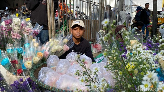 "Saya ambil dari Lembang, bawa 400 batang. Jenisnya ada pahrit, aster, sedap malam dan bunga tabur. Aster macam-macam warnanya," kata Aceng yang sudah belasan tahun jualan bunga musiman.