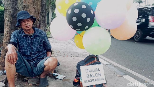 Di antara kendaraan yang lalu-lalang di Jalan Cilamaya, Kota Bandung, terlihat seorang pria duduk santai sambil menyandarkan badannya pada batang pohon rindang. Terlihat pula beberapa balon di depannya yang ditempel tulisan "Dijual, Balon, Seikhlasnya".