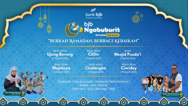 "Sebagai bentuk apresiasi terhadap budaya dan kebiasaan ngabuburit yang telah menjadi bagian dari keseharian masyarakat, bank bjb menggelar serangkaian acara bjb Ngabuburit Bersama Haji Geyot yang akan berlangsung di berbagai lokasi. Acara ini akan hadir di Ujung Berung pada 7 Maret 2025, Alun-Alun Cililin pada 11 Maret 2025, Area Masjid Pusdai pada 12 Maret 2025, Alun-Alun Majalaya pada 14 Maret 2025, Alun-Alun Cicalengka pada 17 Maret 2025, dan Alun-Alun Ciwidey pada 19 Maret 2025," jelas Ayi.