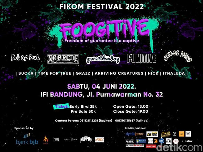 Badan Eksekutif Mahasiswa Fakultas Ilmu Komunikasi Universitas Islam Bandung (BEM FIKOM Unisba) tengah mempersiapkan gelaran acara tahunan miliknya. Konser Fikom Festival 2022 bertajuk "Foogitive - Freedom Guarantee is A Captive" akan dilangsungkan pada Sabtu (4/6/2022) di Gedung IFI Bandung, Jl. Purnawarman nomor 32.