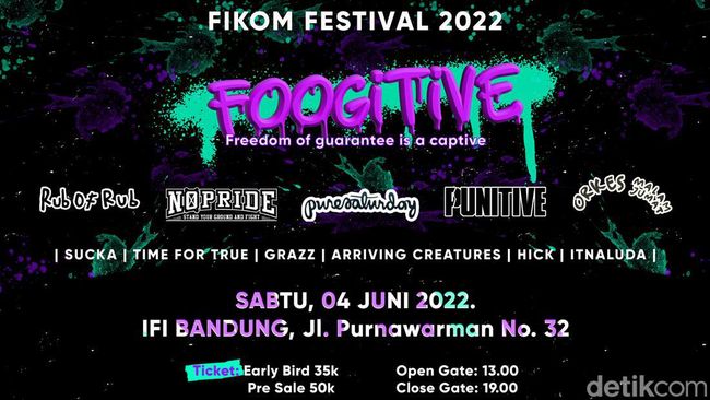 Gelaran musik tahunan BEM Fakultas Ilmu Komunikasi Universitas Islam Bandung (FIKOM Unisba) tinggal menghitung jam. Konser Fikom Festival 2022 bertajuk "Foogitive - Freedom Guarantee is A Captive" akan berlangsung di Gedung IFI Bandung, Jl. Purnawarman nomor 32 Sabtu (4/6/2022) malam ini.