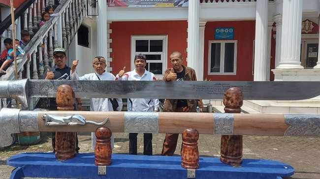 Golok tajam dan raksasa jadi hadiah istimewa dari Kodim 0604 Karawang dalam peringatan HUT ke-77 Kemerdekaan Indonesia yang akan disimpan di Kodam III/Siliwangi. Usut punya usut, golok dengan panjang 7 meter dan berat 700 kilogram itu dibuat pengrajin asal Desa Cibatu, Kabupaten Sukabumi.
