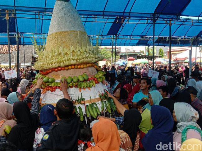 Warga di Desa Larangan, Kecamatan Lohbener, Kabupaten Indramayu berebut gunungan hasil bumi. Hanya beberapa menit, aneka pangan di tumpengan besar ludes.