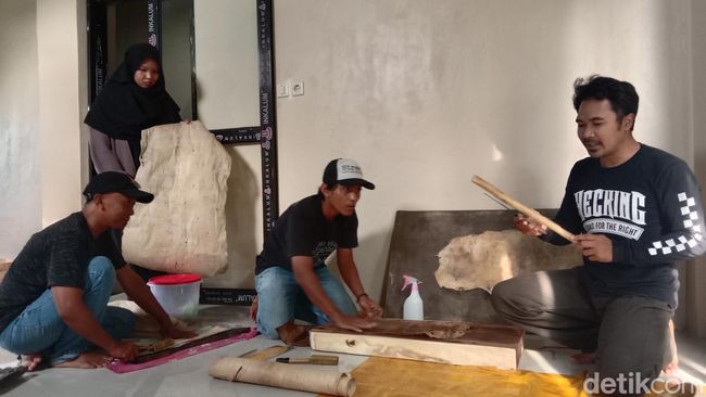 "Kalau pecah juga gak jadi masalah nanti di tambal. Teknik numbuknya pelan-pelan pakai sistem geser, ke kiri atau ke kanan biar melar," ucap Akhmedi sambil menggeprek kulit kayu.