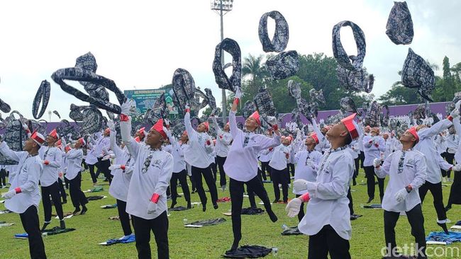 Para santri dengan memakai pakaian putih memenuhi seluruh tribun stadion. Di tengah terdapat sejumlah santri yang berbaris dan tampil membawakan tari saman khas Aceh.