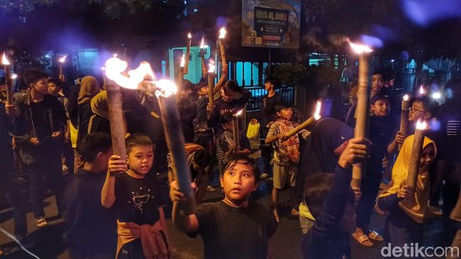 Momen itu terekam saat pawai obor yang berlangsung di Komplek Griya Bandung Indah (GBI), Desa Buahbatu, Kecamatan Bojongsoang, Kabupaten Bandung pada Selasa (21/3/2023) malam. Mereka berjalan beriringan di pinggir jalan mengitari komplek.