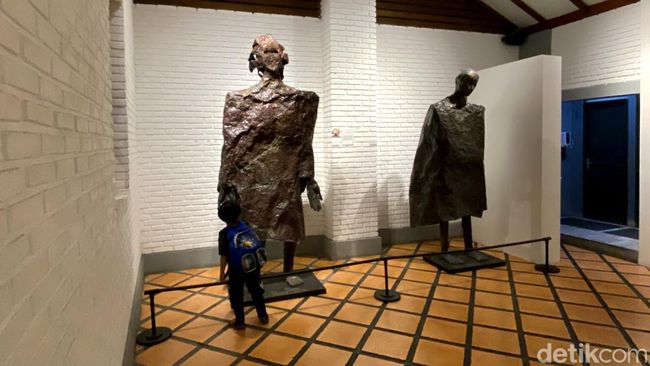 detikJabar berkesempatan mengunjungi pameran Ini, Selasa (14/11/2023). Di ruang utama ada dua patung besar karya Jeihan Sukmantoro. Masih di ruangan utama, ada juga papan biografi Jeihan Sukmantoro.