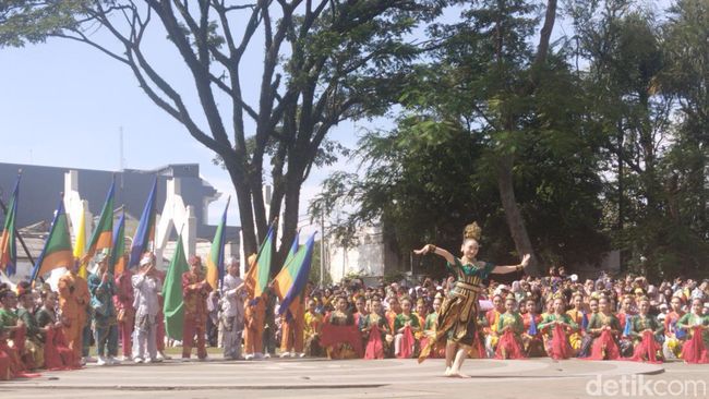 Pantauan detikJabar, Minggu (28/4/2024), ada 1.600 penari yang meramaikan gelaran Cimahi Menari. Ribuan penari memulai tarian kolosal di Jalan Gandawijaya, lalu berjalan menuju Alun-alun Kota Cimahi.