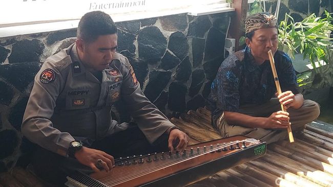 Duduk di baleh bambu, seorang pria berseragam polisi memangku kecapi berwarna coklat. Seorang pria lain di sampingnya bersila dalam balutan batik dengan tangan menggenggam seruling berukuran lumayan panjang.