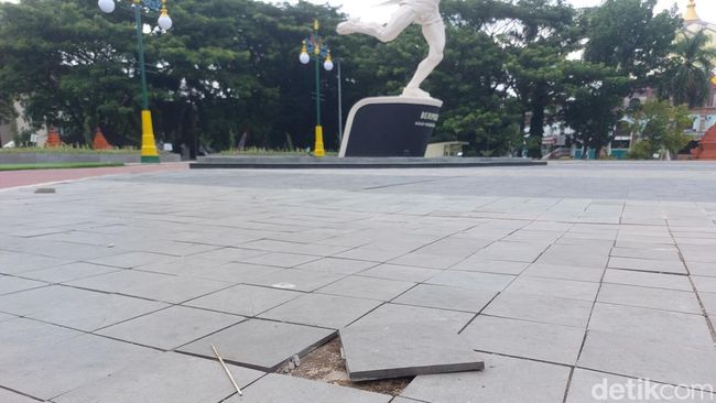 Pantauan detikJabar pada Senin (20/11/2023) kerusakan terlihat di sudut permainan anak taman yang berlokasi di Jalan Sunan Drajat, Kecamatan Sumber, Kabupaten Cirebon itu. Kerusakan seperti copotnya plat besi yang ada di gerbang motif batik megamendung. Selain itu, kerusakan juga terlihat pada batu yang dipasang sebagai lantai taman.