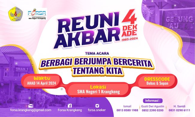 "Reuni akbar 4 dekade SMAN 1 Krangkeng yang temanya berbagi, berjumpa, dan bercerita tentang kita ini rencananya akan dilakukan setelah lebaran nanti. Kami kemas acaranya sesuai tema yang bakal diikuti oleh semua angkatan," kata Ketua Panitia Reuni Akbar 4 Dekade, Ismail, Senin (18/3/2024).