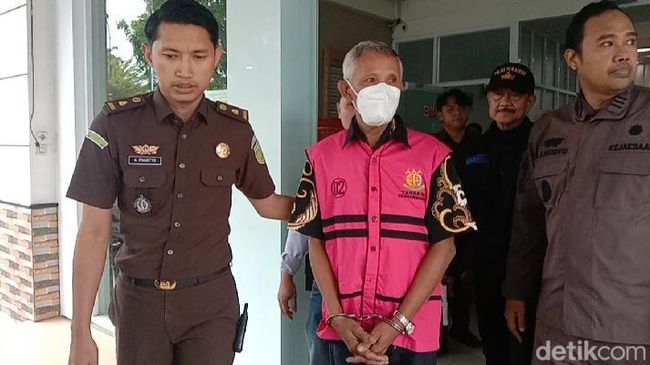 Tersangka Carsim, mantan Kepala Disbudpar Kabupaten Indramayu, terlihat mengenakan rompi merah muda sebelum digelandang ke Rutan Kelas IIB Indramayu. Carsim akan ditahan selama 20 hari ke depan selama proses peradilan.