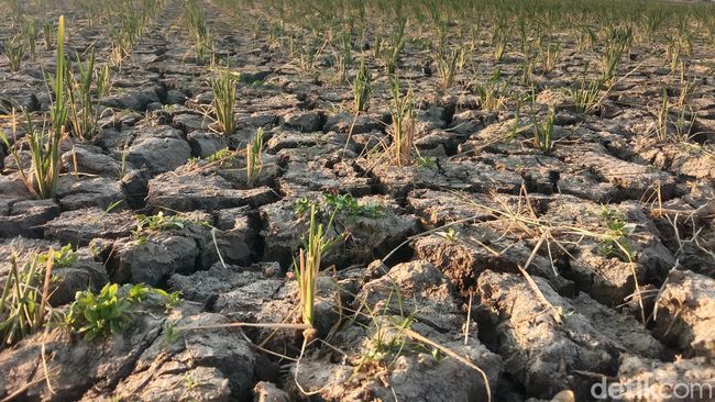 Kekeringan mulai melanda lahan sawah di Kabupaten Indramayu, Jawa Barat. Hijau tanaman padi yang terhampar seperti enggan tumbuh lantaran tanahnya yang terus meretak.