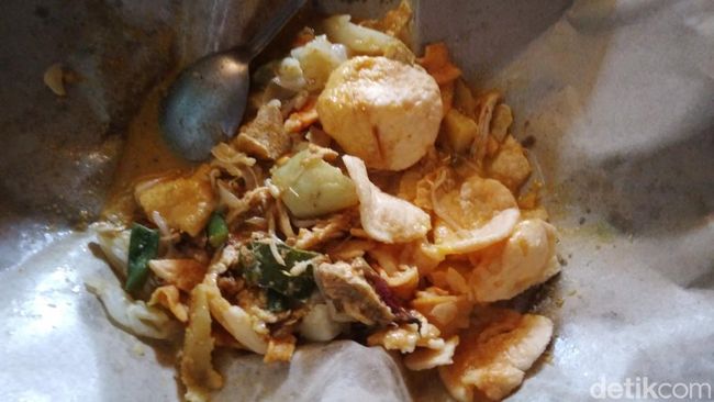 "Isinya itu ada kol, taoge, kacang panjang, bihun rebus, telur, tahu, kentang dan daging ayam. Bahan-bahan tersebut lalu diguyur dengan kuah kuning dan juga sambal kacang. Untuk toppingnya, diberi bawang goreng, kerupuk dan emping manis," tutur Nurapri.
