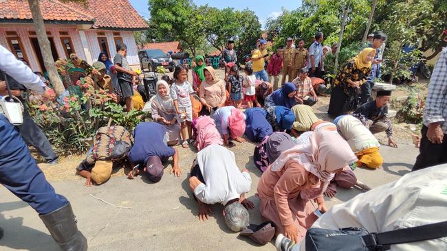 Sejumlah warga bersujud di pekarangan Dusun Cinangka, Desa Cengal, Kecamatan Maja, Kabupaten Majalengka. Aksi itu sebagai wujud syukur karena akhirnya warga bisa bernafas lega setelah mendapat kepastian legalitas hak atas tanah mereka.