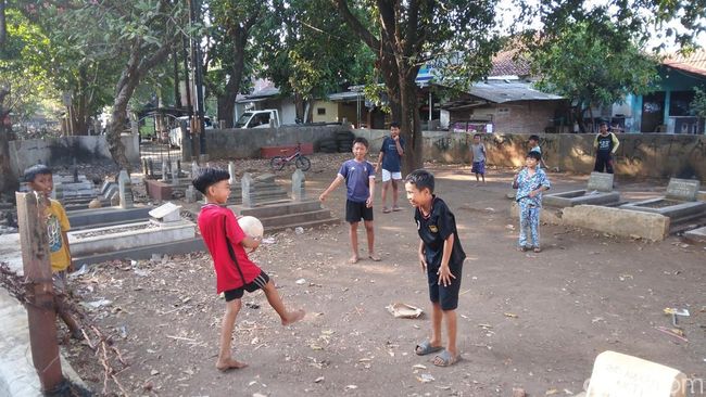 Sore itu, belasan anak-anak tampak sedang asyik bermain bola. Berbeda seperti di tempat lain, anak-anak tersebut bermain bola di area kuburan TPU Kemlaten, Kecamatan Harjamukti, Kota Cirebon.