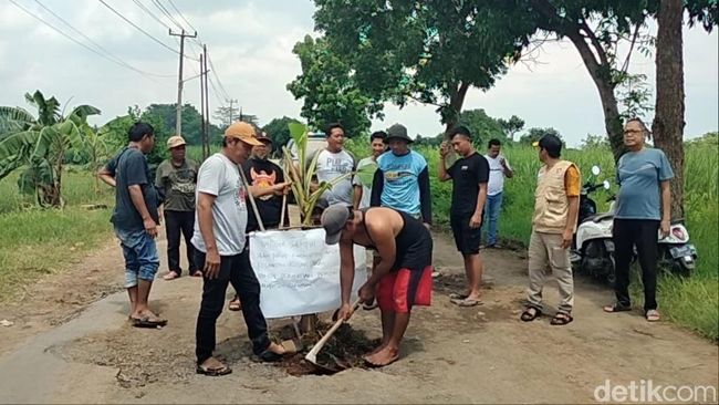 Puluhan warga Desa Sampih, Kecamatan Susukanlebak, Kabupaten Cirebon, meluapkan kekesalan mereka terhadap jalan rusak yang tak kunjung diperbaiki oleh Pemerintah Kabupaten Cirebon. Sebagai bentuk protes, warga menanam pohon pisang di sepanjang jalan berlubang.